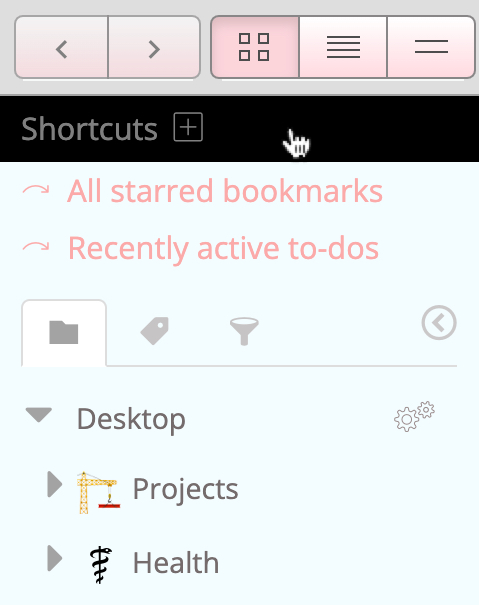 Click on, "Shortcuts" with the plus icon on the left side in order to create a shortcut. This will allow you to save any current "state" (view all, tag filters, time filters, etc...).