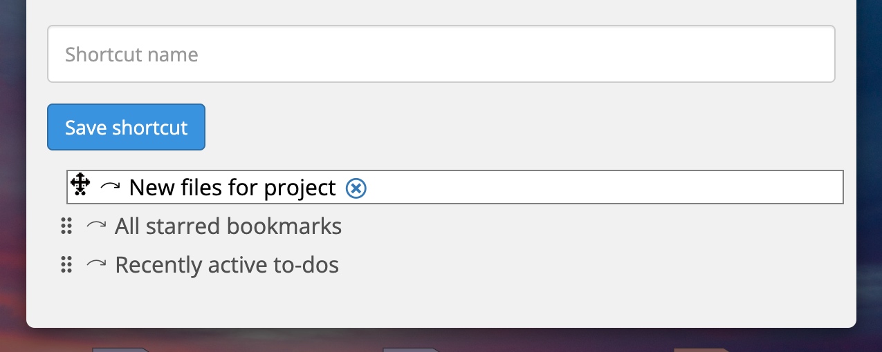 Click on, "Shortcuts" with the plus icon on the left to access the sorting popup. Once the popup is open you can sort your shortcuts by clicking and dragging the small dot icons on the left side of each shortcut.