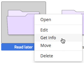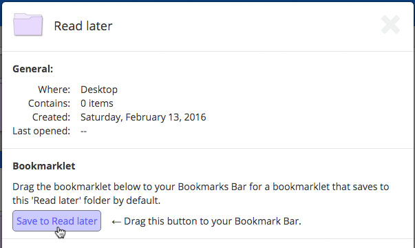 Each folder that you create has it's own bookmarklet that can be used to quicky save web pages to that folder. For example, if you have a 'Read later' folder, you can add a 'Save to Read later' bookmarklet to your Bookmark Bar. When you click the 'Save to Read later' bookmarklet, the 'Read later' folder will be selected by default, allowing for quicker saving.